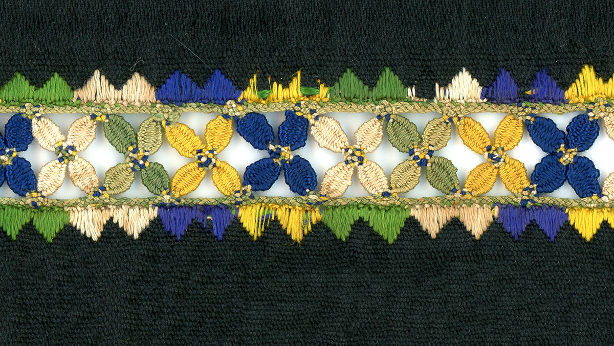 Vydaté ženy nosili vlasy rozdelené na pútec – na dve polovice, ktoré pevne omotávali tkanými šnúrkami. Ak mala žena riedke vlasy, pridávala si k nim konopu, ľan alebo „návlake“ – šnúry upradené z konopných nití. Omotané pramene vlasov si ženy ovinuli okolo hlavy a na to si založili čepiec a šatku. Cez čepiec sa uväzovali stuhy rôznych farieb podľa veku nositeľky alebo príležitosti nosenia.General description Tradičný odev z Dolného Badína je variantom hontianskeho odevu, ktorý sa nosil aj v obciach Horný Badín, Bzovík, Čekovce, Dolný a Horný Jalšovík, Lackov, Litava, Dolné a Horné Mladonice, Selce, Senohrad, Trpín, Uňatín a Kozí Vrbovok. Note detail zdobenia zástery Work owner Jambrichová, Anna (1948) Municipality of origin Dolný Badín, okres Krupina Recorded by Hronček, Lukáš (2000) Other responsibility Hronček, Lukáš (digitalizoval/-a)