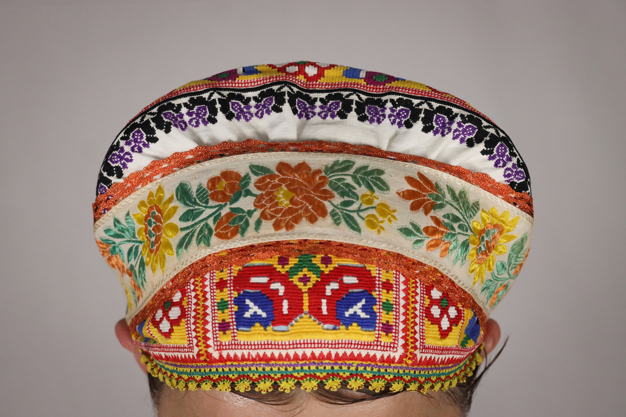 Vydaté ženy nosili vlasy rozdelené na pútec – na dve polovice, ktoré pevne omotávali tkanými šnúrkami. Ak mala žena riedke vlasy, pridávala si k nim konopu, ľan alebo „návlake“ – šnúry upradené z konopných nití. Omotané pramene vlasov si ženy ovinuli okolo hlavy a na to si založili čepiec a šatku. Cez čepiec sa uväzovali stuhy rôznych farieb podľa veku nositeľky alebo príležitosti nosenia.General description Tradičný odev z Dolného Badína je variantom hontianskeho odevu, ktorý sa nosil aj v obciach Horný Badín, Bzovík, Čekovce, Dolný a Horný Jalšovík, Lackov, Litava, Dolné a Horné Mladonice, Selce, Senohrad, Trpín, Uňatín a Kozí Vrbovok. Note celkový pohľad na čepiech zvrchu Work owner Jambrichová, Anna (1948) Municipality of origin Dolný Badín, okres Krupina Recorded by Hronček, Lukáš (2000) Other responsibility Hronček, Lukáš (digitalizoval/-a)