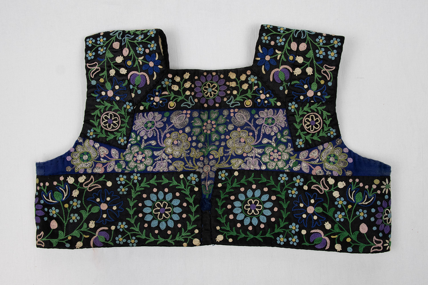 Žena má na hlave „kápku“ – čepiec spevnený „kotúčkou“ – drôtenou výstuhou. Predná vyšívaná zamatová časť čepca sa nazývala „predňička“. Uväzovanie čepca v zátylku prekrýva ozdobná vyšívaná „šnúrka“ – stuha, ktorá siaha niže pása. Čepiec prekrýva šatka vyšívaná „krivou ihlou“. Žena má na nohách obuté kožené čižmy.General description Note celkový pohľad na živôtik zozadu Work owner Kucbeľová, Jana (1963) Date of creation 1. štvrtina 20. storočia Municipality of origin Očová, okres Zvolen Recorded by Hronček, Lukáš (2000) Other responsibility Hronček, Lukáš (digitalizoval/-a)