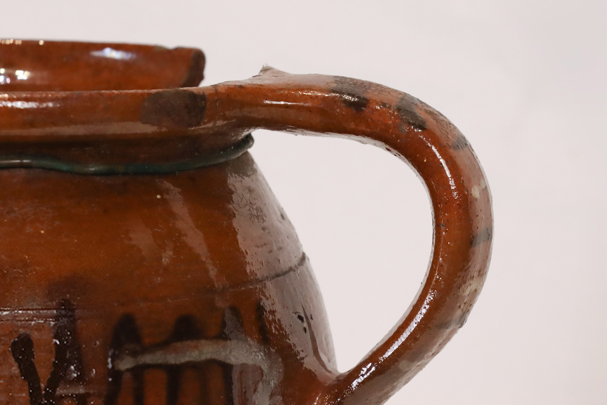 1. Descripton Nádoba na tekutinu s jedným uchom je točená na kruhu. Je vysoká 24 cm, priemer v najširšej časti je 20 cm, priemer otvoru je 15 cm. Z vnútornej aj vonkajšej strany je glazovaná zelenou glazúrou. Džbán zdobia rastlinné ornamenty, vzory maľované voľnou rukou bielou a čiernou hlinkou a vyrytá ryha.