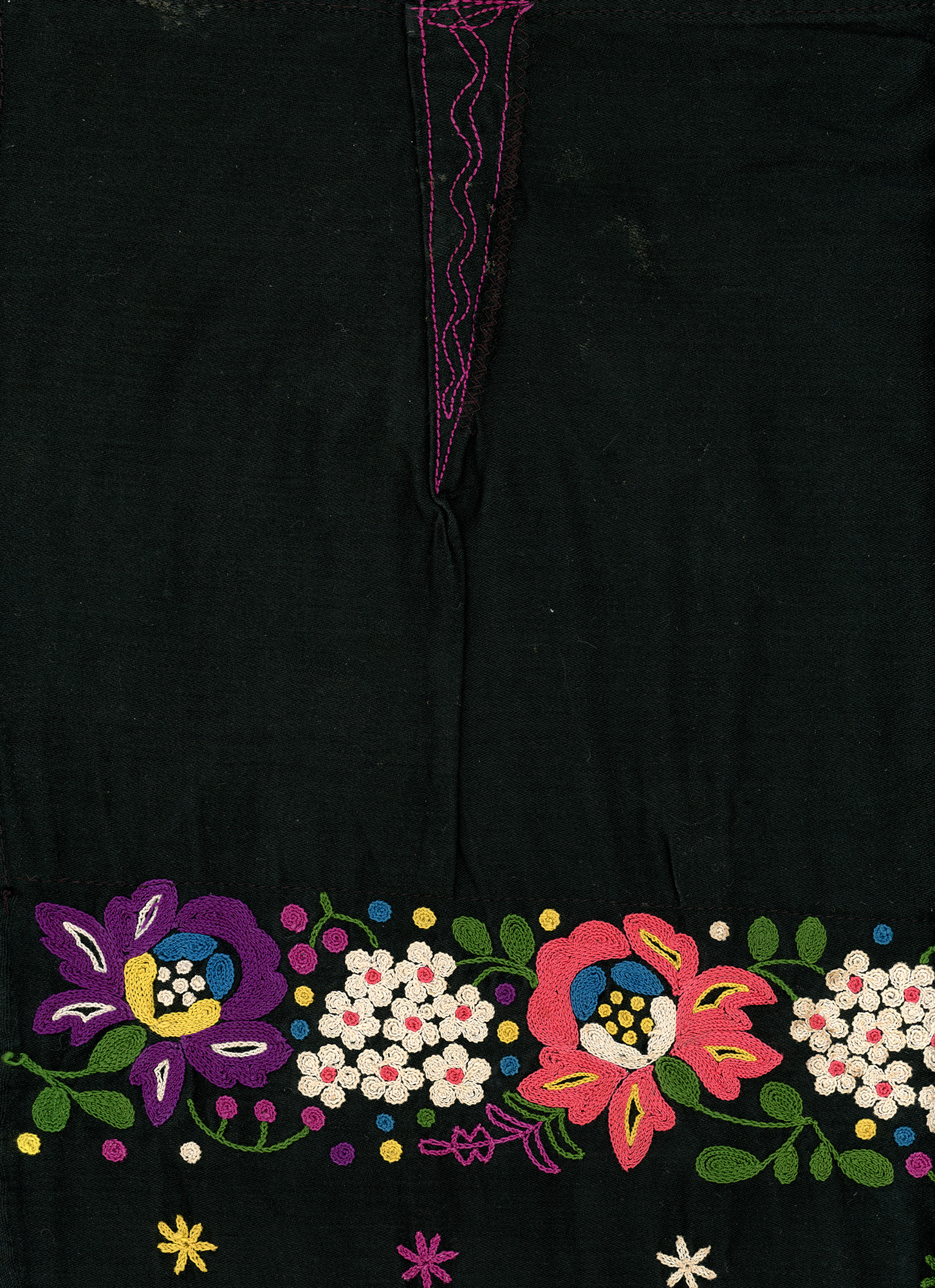 - Descripton - Mužská zástera z čierneho glotu je ušitá z jedného dielu látky. Šírka zástery je 67 cm, dĺžka 68 cm, strapce majú dĺžku 1 cm. Zásteru zdobí štepovanie strojom, výšivka „krivou ihlou“ a „krepindľa“ – ozdobná stuha našitá 10 cm od spodného okraja. - Note - detailný pohľad - Work owner - Sebíň, Štefan (1986) - Date of creation - 30. roky 20. storočia - Municipality of origin - Korytárky, okres Detva - Recorded by - Hronček, Lukáš (2000) - Other responsibility - Hronček, Lukáš (digitalizoval/-a)