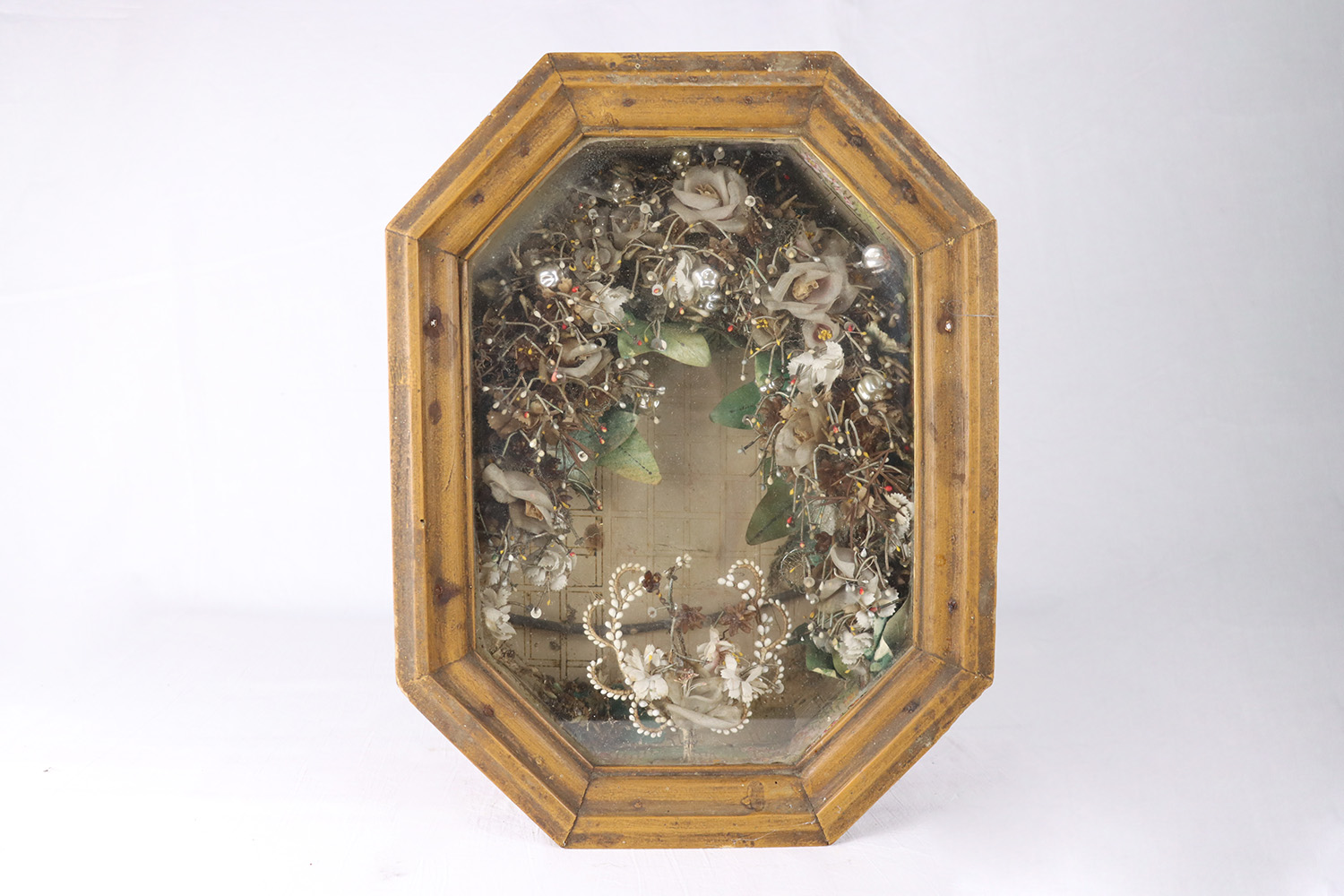 Descripton Na fotografiách je zdokumentovaný svadobný veniec a pierko umiestnené v drevenej presklenej skrinke. Veniec a pierko tvoria textilné a voskové kvety a listy, ozdoby z fúkaného skla a „trasielka“ – tenké drôty stáčané do pružiniek, ktoré sú ukončené flitrami a voskovanými slzičkami. General description V 20. storočí sa svadobné vence a pierka začali zhotovovať z umelých kvetov a rôznych ozdôb. V Sáse a okolitých obciach sa od 30. rokov 20. storočia po svadbe umiestňovali do drevených presklených skriniek. Ich rámy často bývali vyrezávané technikou nízkeho reliéfu a farebne maľované. Do stredu venca sa zvyčajne umiestňovala fotografia ženícha a nevesty. Manželia si takto veniec a pierko často opatrovali pre spomienku až do svojej smrti. Note celkový pohľad spredu Work owner Obec Sása Date of creation 2. štvrtina 20. storočia Municipality of origin Sása, okres Zvolen Recorded by Hronček, Lukáš (2000) Other responsibility Hronček, Lukáš (digitalizoval/-a)