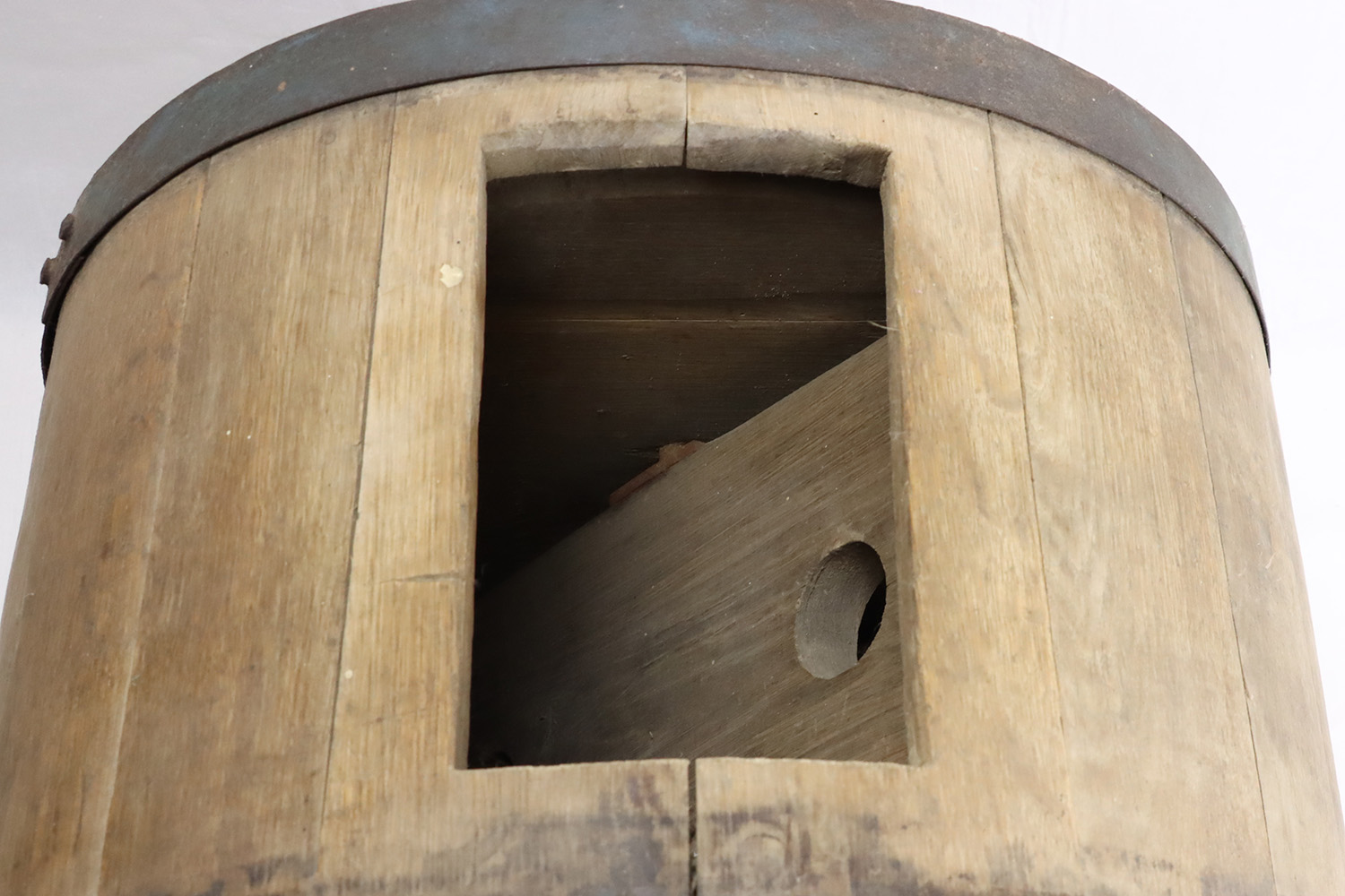 1. Descripton Drevená práčka kužeľovitého tvaru s priemerom 43 cm je 44 cm vysoká a 30 cm široká, priemer otvoru na vkladanie bielizne má rozmery 18 cm × 11 cm. Drevené časti sú spojené kovovými obručami. Kovová ručná kľuka s drevenou rukoväťou slúžila na poháňanie vnútorného mechanizmu.