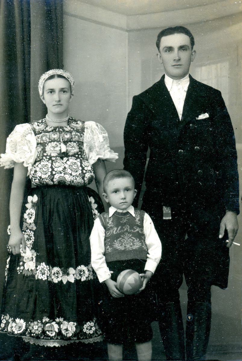 - Descripton - Na fotografii je zaznamenaná rodina Jombíková zo Slatinských Lazov, vľavo Anna Jombíková, narodená v roku 1914, vpravo Marián Jombík, narodený v roku 1910, v strede sa nachádza syn Juraj, narodený v roku 1934. Všetci traja sú oblečení v sviatočnom odeve.