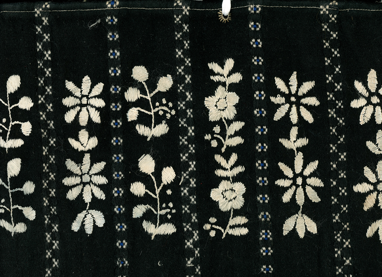 Descripton Na fotografii je zaznamenaný ženský sviatočný odev z Očovej datovaný do 1. štvrtiny 20. storočia. Nosili ho ženy v strednom veku v čase adventu, pôstu alebo v období smútku za vzdialenejšou osobou. Tvorí ho: „stánka“ – spodný odev, „opľecko“ – krátka košeľa, „prusľak“ – živôtik, „kitľa“ – sukňa, „šata“ – zástera, „spodňe“ – spodné sukne a „kosička“ – trojrohá šatka. Spodný odev je ušitý z domáceho plátna zo šiestich „puol“ – dielov. Časť nadšitá od pása nahor je zhotovená z činovate a doplnená vzorom vyšitým plným plochým stehom. Nazývala sa „stan“ a siahala po pazuchy. „Virezávanuo opľecko“ – košeľa vyšívaná „krivou ihlou“ sa pod hrdlom uväzovala šnúrkou tkanou na krosienkach. Živôtik je ušitý ručne z čierneho glotu a podšitý domácim plátnom. Zdobí ho výšivka „krivou ihlou“. Sukňa je zhotovená z modrotlače. V spodnej časti ju zdobí výšivka „krivou ihlou“. Spodný okraj lemuje stuha a lemovka so štetinami, ktoré sa nazývali „kefka“. Zástera z čierneho glotu je ušitá z dvoch dielov látky a naskladaná do „obalku“ – do pásu. Jej šírka je 250 cm, dĺžka 90 cm. Zdobí ju vzor vyšitý „pravou ihlou“ hodvábnou niťou plným plochým stehom. Okraje sú lemované „krivou ihlou“ vyšívanými a vyrezávanými zubami. Pod vrchnú sukňu sa obliekali dve až tri spodné sukne z bieleho plátna. Pod živôtikom sa nosila trojrohá šatka prehodená okolo krku, prekrížená na hrudníku a uviazaná vzadu na páse. Je zhotovená z čierneho glotu a jej konce – „uši“ sú vyšité „krivou ihlou“ a vyrezávané.