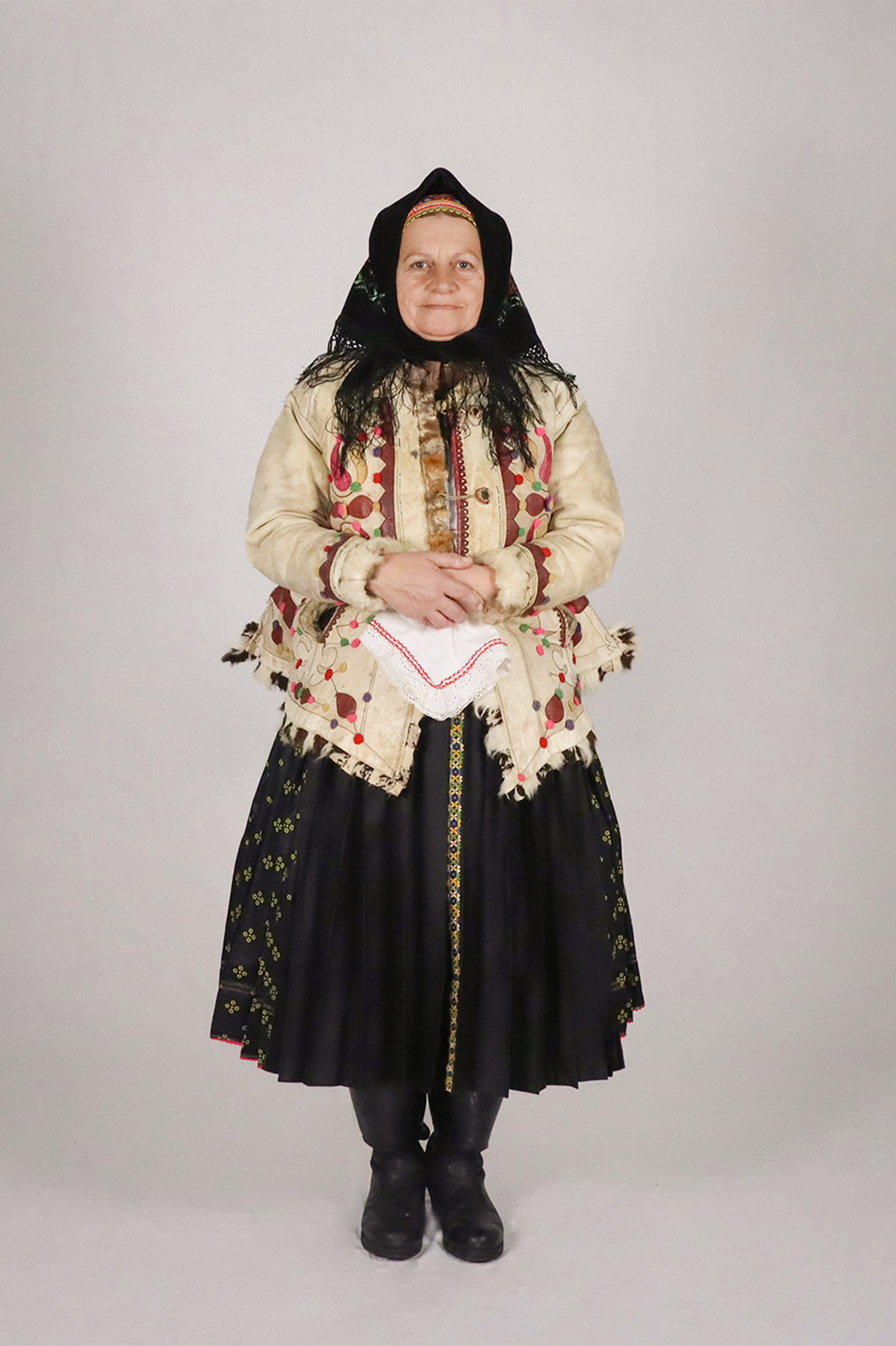 2. Ženský zimný odev z Dolného Badína je datovaný do 1. polovice 20. storočia. Tvorí ho: „stánka“ alebo „sťahovička“ – spodný odev, „opľecko“ – krátka košeľa, „spodné keceľe“ – spodné sukne, „kitľa“ – sukňa, „šata“ – zástera, „kudmeň“ – kožuch. Spodný odev je ušitý z domáceho plátna a siaha po bedrá. Predná časť je bez výzdoby, chrbtová časť je vyšitá „na krížik“ – krížikovou výšivkou. Košeľa je zhotovená z domáceho plátna, pod hrdlom sa zapína háčikom. Priečne cez rukáv je zdobená kombináciou viacerých vyšívacích techník. Čierny vzor, ktorý lemuje výšivku, nazývali „pavúčike“. Biely kožuch s dlhými rukávmi nazývaný „strakáň“ je v prednej časti bohato zdobený farebnými koženými aplikáciami a farebnými vlnenými brmbolcami. Na modrotlačovej sukni je uviazaná „šata“ – zástera z čierneho glotu. Skladá sa z dvoch dielov, ktoré sú zošité paličkovanou čipkou a farebným ozdobným spojovacím stehom. Je nariasená a všitá do „hadzoki“ – pása, ktorý zdobí krížiková výšivka. Pod sukňu sa obliekali dve až tri spodné sukne z bieleho plátna. Zdobí ich „ďierčenuo višívaňia“ – výšivka po vytiahnutej niti, štepovanie strojom, krížiková výšivka alebo našité farebné stuhy. Žena má na nohách obuté kožené čižmy s tvrdou sárou.
