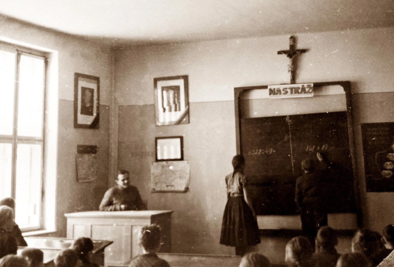 5. fotografia dokumentujúca I. triedu Štátnej ľudovej školy v Klokoči v roku 1941, ktorú v tom čase navštevovalo 25 chlapcov a 19 dievčat, v pozadí učiteľka Božena Marešová