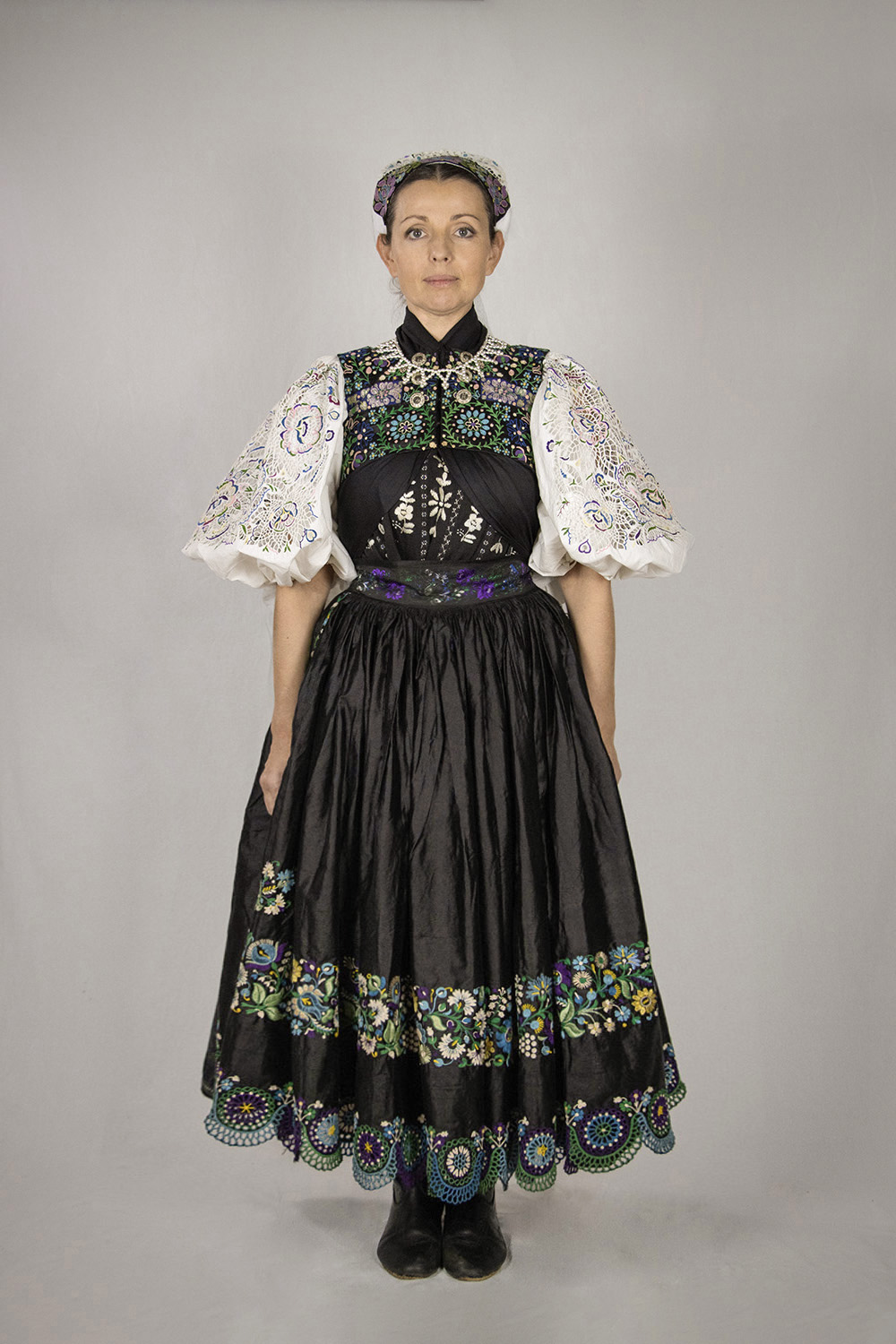 Žena má na hlave „kápku“ – čepiec spevnený „kotúčkou“ – drôtenou výstuhou. Predná vyšívaná zamatová časť čepca sa nazývala „predňička“. Uväzovanie čepca v zátylku prekrýva ozdobná vyšívaná „šnúrka“ – stuha, ktorá siaha niže pása. Čepiec prekrýva šatka vyšívaná „krivou ihlou“. Žena má na nohách obuté kožené čižmy.Všeobecný popis Poznámky celkový pohľad spredu Majiteľ/-ka diela Kucbeľová, Jana (1963) Dátum vzniku diela 1. štvrtina 20. storočia Obec pôvodu Očová, okres Zvolen Autor/-ka záznamu Hronček, Lukáš (2000) Ďalšia zodpovednosť Hronček, Lukáš (digitalizoval/-a)