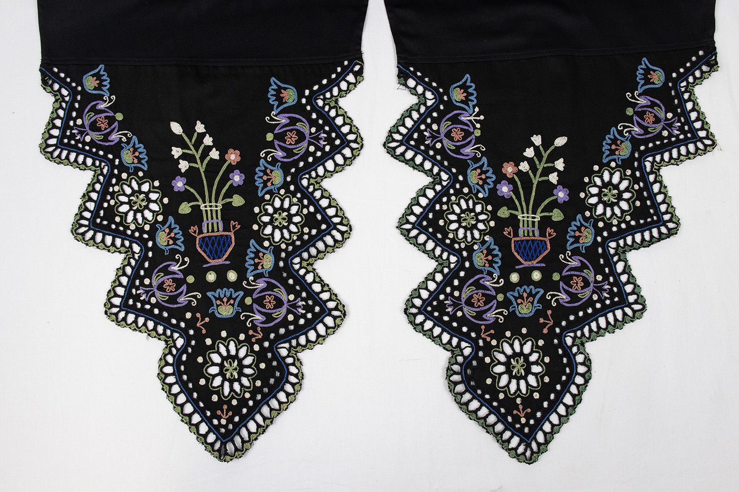 Žena má na hlave „kápku“ – čepiec spevnený „kotúčkou“ – drôtenou výstuhou. Predná vyšívaná zamatová časť čepca sa nazývala „predňička“. Uväzovanie čepca v zátylku prekrýva ozdobná vyšívaná „šnúrka“ – stuha, ktorá siaha niže pása. Čepiec prekrýva šatka vyšívaná „krivou ihlou“. Žena má na nohách obuté kožené čižmy.Všeobecný popis Poznámky detail zdobenia trojrohej šatky Majiteľ/-ka diela Kucbeľová, Jana (1963) Dátum vzniku diela 1. štvrtina 20. storočia Obec pôvodu Očová, okres Zvolen Autor/-ka záznamu Hronček, Lukáš (2000) Ďalšia zodpovednosť Hronček, Lukáš (digitalizoval/-a)