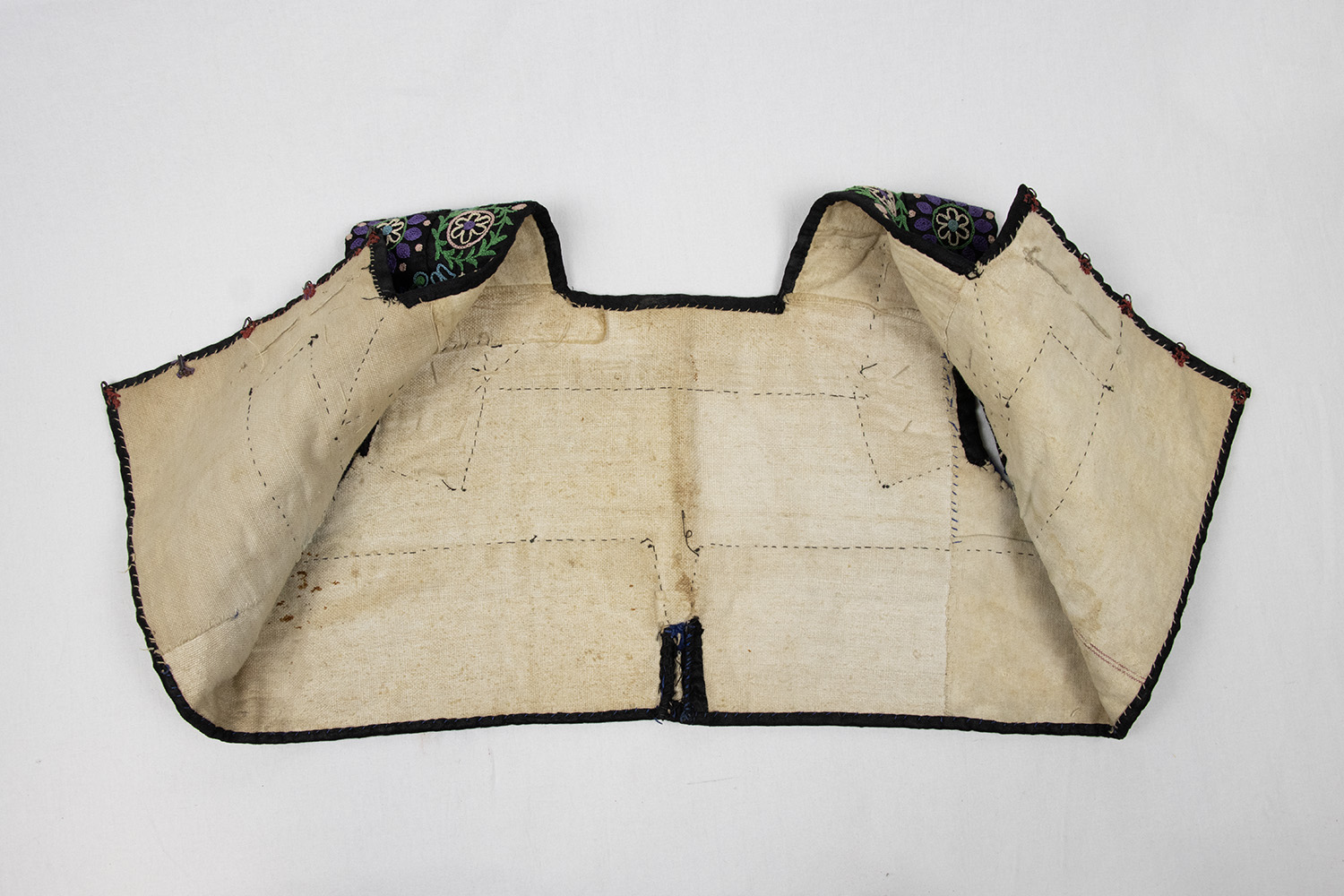 Žena má na hlave „kápku“ – čepiec spevnený „kotúčkou“ – drôtenou výstuhou. Predná vyšívaná zamatová časť čepca sa nazývala „predňička“. Uväzovanie čepca v zátylku prekrýva ozdobná vyšívaná „šnúrka“ – stuha, ktorá siaha niže pása. Čepiec prekrýva šatka vyšívaná „krivou ihlou“. Žena má na nohách obuté kožené čižmy.Všeobecný popis Poznámky celkový pohľad na vnútro živôtika Majiteľ/-ka diela Kucbeľová, Jana (1963) Dátum vzniku diela 1. štvrtina 20. storočia Obec pôvodu Očová, okres Zvolen Autor/-ka záznamu Hronček, Lukáš (2000) Ďalšia zodpovednosť Hronček, Lukáš (digitalizoval/-a)