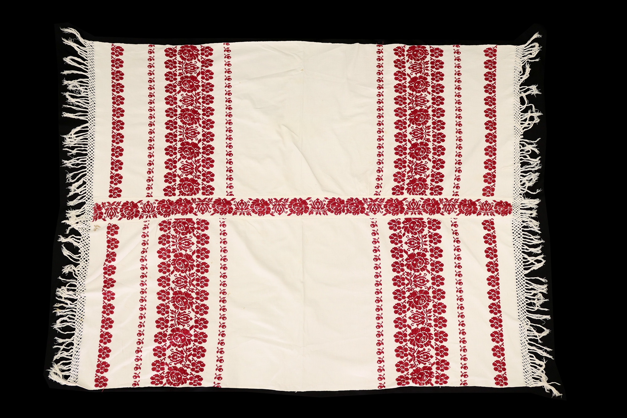 Popis Plachta s rozmermi 154 cm × 130 cm je zhotovená z bieleho plátna zdobeného tkáčskou technikou nazývanou preberanie. Je to spôsob tkania, pri ktorom sa pracuje na jednej osnove s dvoma útkami. Jeden z nich tvorí základnú väzbu plátna a druhý, farebný, tvorí plastické ornamenty. To znamená, že červené nite, ktoré tvoria vzor, sa nachádzajú nad osnovnými niťami na povrchu tkaniny. Plachta je zhotovená z dvoch dielov, ktoré sú spojené vytkávaným pásom. Okraje sú na obidvoch stranách ukončené ručne viazanými strapcami s dĺžkou 13 cm. Všeobecný popis Odevné plachty nosili ženy na ochranu pred vetrom alebo dažďom. V zime si nimi chránili kožuchy pred vlhkým snehom. Zahaľovali sa do nich viacerými spôsobmi. Zväčša ich nosili prehodené cez hlavu alebo plecia. V 2. štvrtine 20. storočia plachty v Slatinských Lazoch nahradili vlniaky. Odevná plachta slúžila aj ako bytový textil. Najčastejšie sa využívala ako obrus pri sviatočných príležitostiach a tiež na prenos nákladu alebo dieťaťa na chrbte. Majiteľ/-ka diela Bahýľová, Anna (1947) Dátum vzniku diela 1. polovica 20. storočia Obec pôvodu Slatinské Lazy, okres Detva Autor/-ka záznamu Hronček, Lukáš (2000) Ďalšia zodpovednosť Hronček, Lukáš (digitalizoval/-a)